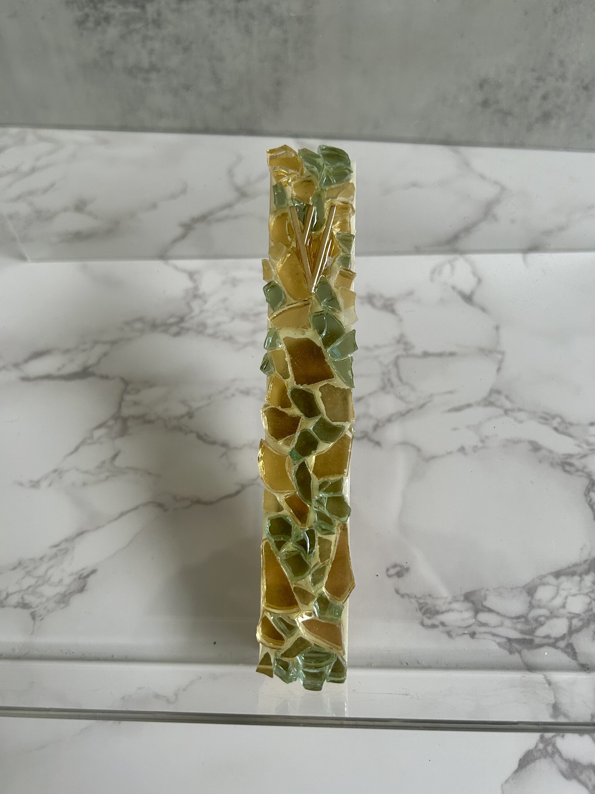 **Please note that the candle sticks. matches and blessing card isn't included** if you would like specific colors and if you would like to add a name to make it personalized please write it in the order notes section in checkout choose up to three colors if using fire glass Blue Green Aqua Gold Silver Rose Gold Bronze *1-2 week processing time*Crafted with precision, this Mezuzah embodies serenity with its gold hue and flickers of rose gold and gold fireglass. The gold shin adds divine symbolism, making it a timeless fusion of tradition and elegance.