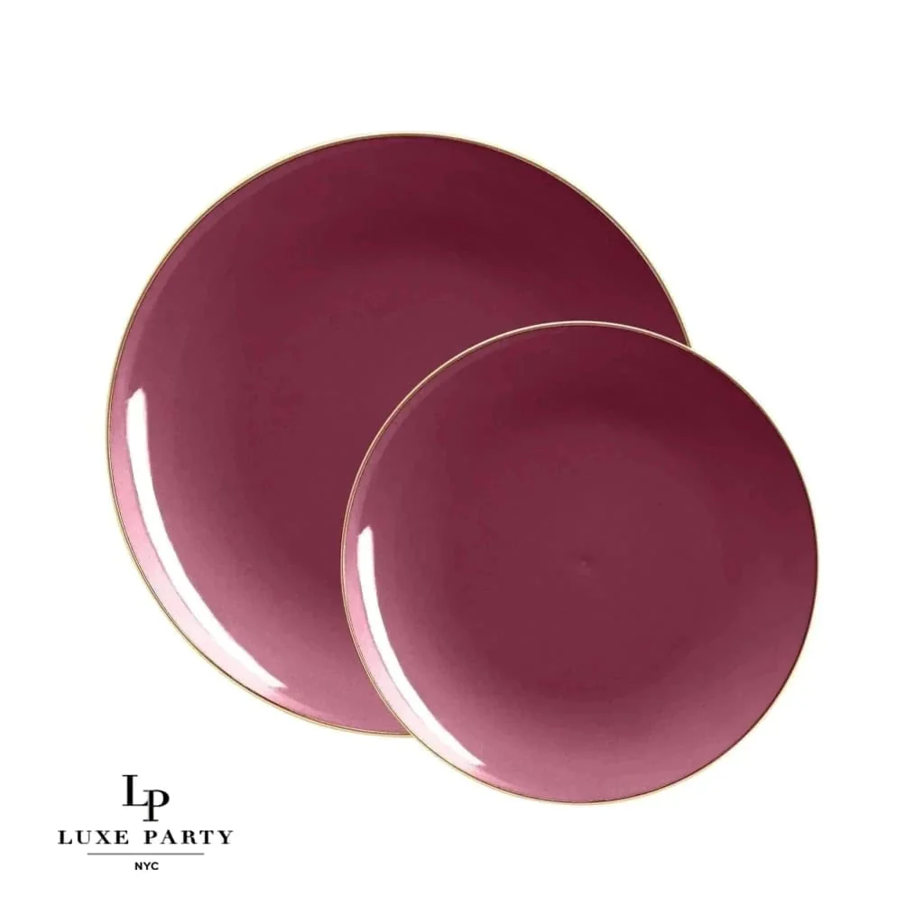 Round Cranberry Red and Gold Plastic Dinner and Salad Plates
